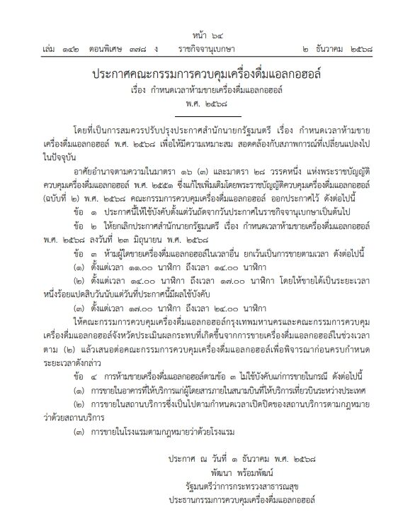 ประกาศจากคณะกรรมการควบคุมเครื่องดื่มแอลกอฮอล์ ปรับปรุงช่วงเวลาห้ามจำหน่ายเครื่องดื่มแอลกอฮอล์ ภายใต้อำนาจตาม พ.ร.บ.ควบคุมเครื่องดื่มแอลกอฮอล์ พ.ศ.2551 และฉบับแก้ไข พ.ศ.2568 เพื่อให้เหมาะสมกับสถานการณ์ปัจจุบันมากยิ่งขึ้น
