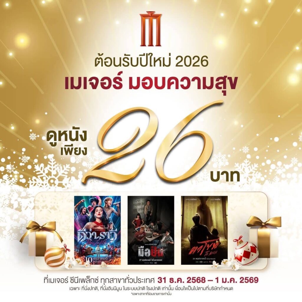 ข่าวประชาสัมพันธ์ ✨ 🎊ส่งท้ายปีเก่า ต้อนรับปีใหม่ 2026 เมเจอร์กรุ้ปมอบความสุขส่งท้ายปี ดูหนังเพียง 26 บาท 🎬🎉 Webmaster 31 ธันวาคม 2025 ✨ 🎊ส่งท้ายปีเก่า ต้อนรับปีใหม่ 2026 เมเจอร์กรุ้ปมอบความสุขส่งท้ายปี ดูหนังเพียง 26 บาท 🎬🎉ตั้งแต่ 31 ธ.ค. 2568 – 1 ม.ค. 2569ที่ เมเจอร์ ซีนีเพล็กซ์ ทุกสาขาทั่วประเทศ (เฉพาะภาพยนตร์ที่ร่วมรายการ) เมเจอร์ส่งความสุข #MajorCineplex #HappyNewYear2026 #majorgroup จำนวนคนดู : 19 Continue Reading Previous: เริ่มแล้ว งานหนาวนี้ที่เมืองแกน 2569ชวนสัมผัสเสน่ห์วิถีชุมชน เที่ยวหนาวอย่างยั่งยืนNext: อบจ.เชียงใหม่ จัดกิจกรรมเดิน–วิ่งเพื่อสุขภาพ “Twilight Run” ครั้งที่ 7 🏃♂️🏃♀️กระตุ้นการออกกำลังกายอย่างยั่งยืน ห่างไกลยาเสพติด Related Stories ข่าวประชาสัมพันธ์ กรรมการมูลนิธิต่อต้านโรคมะเร็งภาคเหนือ เข้าพบเลขาธิการมูลนิธิขาเทียม เนื่องในโอกาสวันขึ้นปีใหม่ Webmaster 13 มกราคม 2026 ข่าวประชาสัมพันธ์ ผู้ใช้ถนนรอบ มช. โปรดวางแผนการเดินทาง เลื่องเส้นทางโดยรอบมหาวิทยาลัยเชียงใหม่ระหว่างวันที่ 17 ถึง 22 มกราคม 2569 Webmaster 13 มกราคม 2026 ข่าวประชาสัมพันธ์ เชียงใหม่ จังหวัดเชียงใหม่จัดพิธีบวงสรวงเสริมสิริมงคล เตรียมความพร้อมจัดงานฤดูหนาว นางสาวเชียงใหม่ และงาน OTOP ของดีเมืองเชียงใหม่ ประจำปี 2569 Webmaster 6 มกราคม 2026