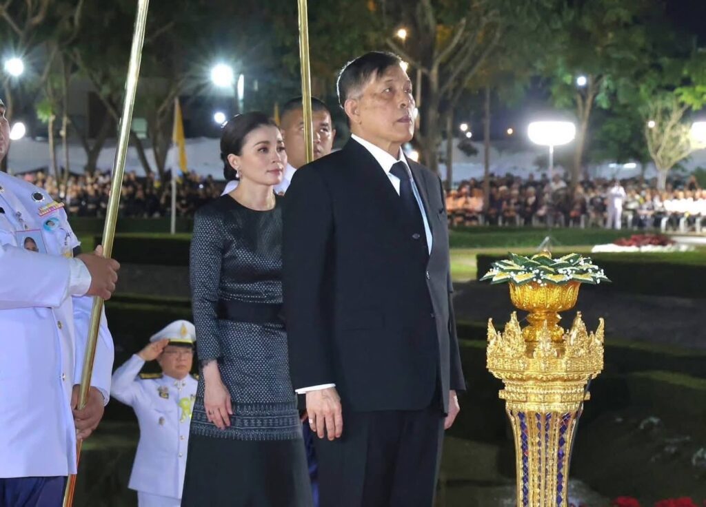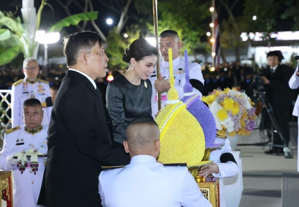 จากนั้น เสด็จออกจากพลับพลาพิธีไปยังแท่นพิธี ทรงกดปุ่มไฟฟ้าเปิดแพรคลุมป้ายพระราชานุสาวรีย์ ฯ พระสงฆ์เจริญชัยมงคลคาถา กองทหารเกียรติยศสำหรับพระราชานุสาวรีย์ ฯ ถวายความเคารพ วงดุริยางค์บรรเลงเพลงสรรเสริญพระบารมี ชาวพนักงานลั่นฆ้องชัย ประโคมสังข์ แตร ดุริยางค์ ต่อจากนั้น เสด็จขึ้นลานพระราชานุสาวรีย์ ฯ ทรงพระสุหร่าย ทรงเจิมแผ่นคำจารึกที่ฐานพระราชานุสาวรีย์ ฯ พระบาทสมเด็จพระเจ้าอยู่หัว และสมเด็จพระนางเจ้า ฯ พระบรมราชินี ทรงวางพุ่มดอกไม้ และทรงจุดธูปเทียนเครื่องทองน้อยถวายราชสักการะ ทรงกราบ เสร็จแล้ว เสด็จเข้าพลับพลาพิธี ทรงประเคนจตุปัจจัยไทยธรรมถวายพระสงฆ์ ทรงหลั่งทักษิโณทก พระสงฆ์ถวายอนุโมทนา ถวายอดิเรก