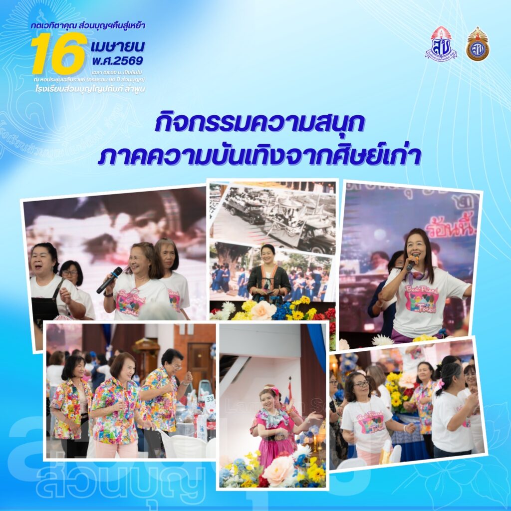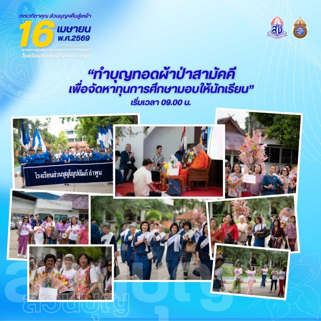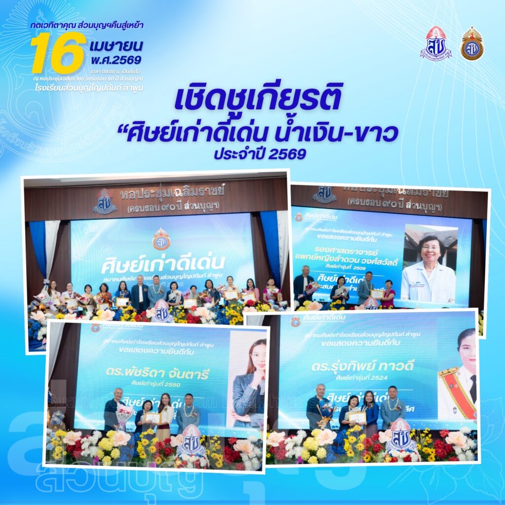 สมาคมศิษย์เก่าโรงเรียนส่วนบุญโญปถัมภ์ ลำพูน ขอเชิญศิษย์เก่าทุกท่านร่วมงาน “กตเวทิตาคุณ ส่วนบุญคืนสู่เหย้า ประจำปี 2569” ในวันพฤหัสบดีที่ 16 เมษายน 2569 ตั้งแต่เวลา 08.00 น. เป็นต้นไป ณ หอประชุมเฉลิมราชย์ (ครบรอบ 90 ปี ส่วนบุญฯ) โรงเรียนส่วนบุญโญปถัมภ์ ลำพูน