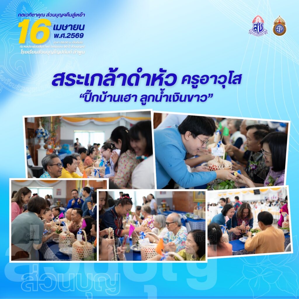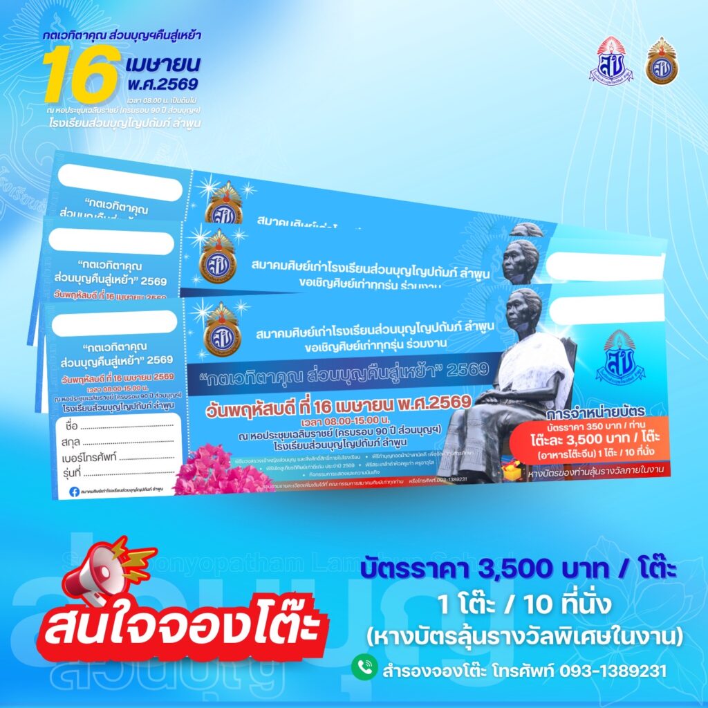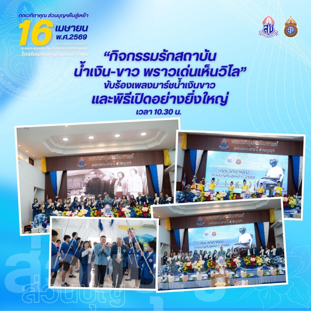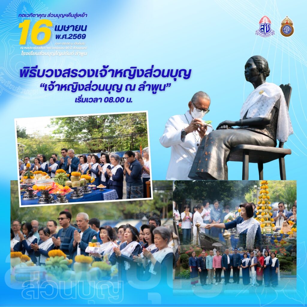 สมาคมศิษย์เก่าโรงเรียนส่วนบุญโญปถัมภ์ ลำพูน ขอเชิญศิษย์เก่าทุกท่านร่วมงาน “กตเวทิตาคุณ ส่วนบุญคืนสู่เหย้า ประจำปี 2569” ในวันพฤหัสบดีที่ 16 เมษายน 2569 ตั้งแต่เวลา 08.00 น. เป็นต้นไป ณ หอประชุมเฉลิมราชย์ (ครบรอบ 90 ปี ส่วนบุญฯ) โรงเรียนส่วนบุญโญปถัมภ์ ลำพูน