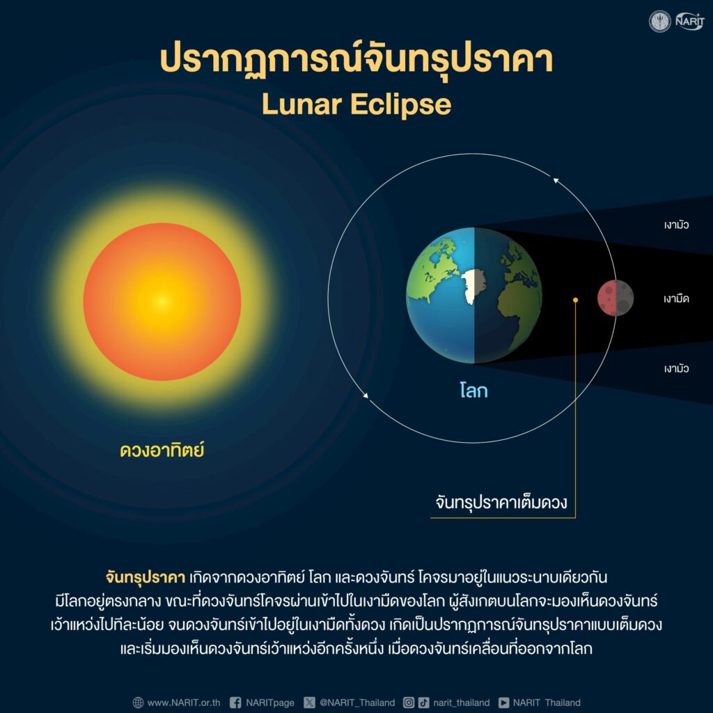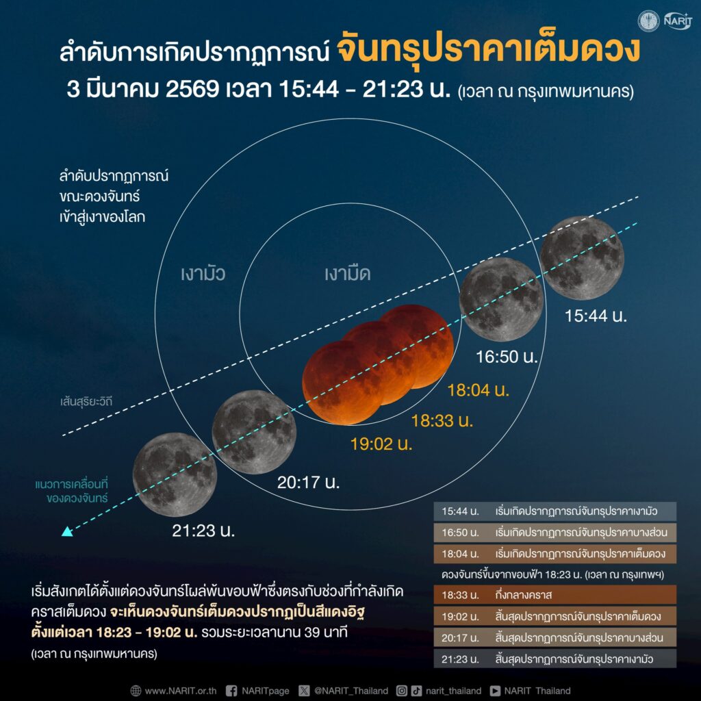 สถาบันวิจัยดาราศาสตร์แห่งชาติ หรือ NARIT กระทรวง อว. เผย คืนวันที่ 3 มี.ค. 69 จะเกิดปรากฏการณ์จันทรุปราคา ตั้งแต่เวลา 15:44 – 21:23 น. (เวลาไทย)