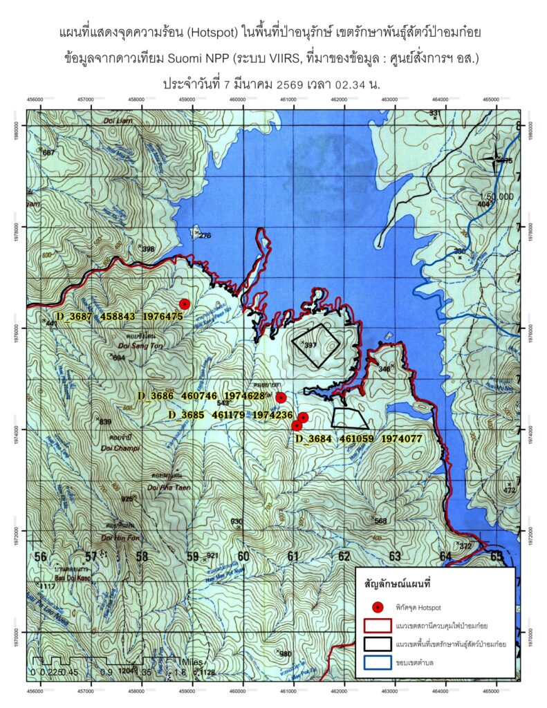 สถานีควบคุมไฟป่าอมก๋อย พื้นที่แบบบูรณาการเชิงพื้นที่ป่าอนุรักษ์ เขตรักษาพันธุ์สัตว์ป่าอมก๋อย สำนักบริหารพื้นที่อนุรักษ์ที่ 16 เชียงใหม่ ได้รับรายงานจากศูนย์สั่งการ สบอ.16 เชียงใหม่ พบจุดความร้อน (Hotspot) เมื่อวันที่ 7 มีนาคม 2569 เวลา 02.34 น. ในพื้นที่เขตรักษาพันธุ์สัตว์ป่าอมก๋อย ท้องที่บ้านดอยแก้ว ตำบลมืดกา อำเภอดอยเต่า จังหวัดเชียงใหม่ จำนวน 4 จุด